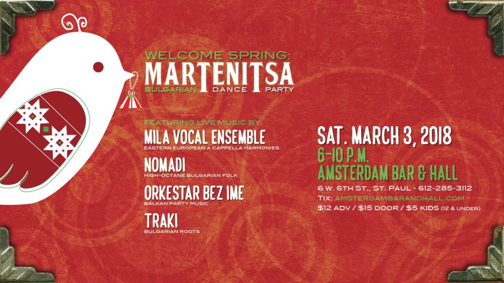 Orkestar Bez Ime (OBI), Mila Vocal Ensemble, Traki and Nomadi proudly present Martenitsa, an annual Balkan celebration of spring—now at the Amsterdam Bar & Hall in St. Paul. What started as a small underground gathering of Balkan music-obsessed fans and the local Bulgarian community has grown into a massive Balkan dance party! Each group will perform both individually and collaboratively to celebrate not only Martenitsa but also Bulgarian Independence Day.